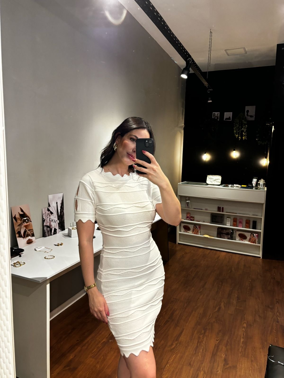 Vestido confeccionado em tricô modal, proporcionando toque macio e confortável ao corpo. O modelo apresenta comprimento médio, ideal para ocasiões casuais e elegantes, com uma modelagem que valoriza a silhueta.